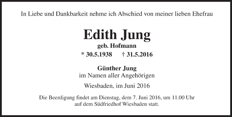 Hier finden Sie alle Traueranzeigen aus der Zeitung, die bisher für Edith Jung erschienen sind. Weitere Traueranzeigen, die in der Zeitung erscheinen, werden hier ebenfalls aufgelistet