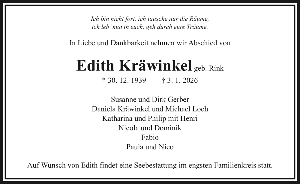 Hier finden Sie alle Traueranzeigen aus der Zeitung, die bisher für Edith Kräwinkel erschienen sind. Weitere Traueranzeigen, die in der Zeitung erscheinen, werden hier ebenfalls aufgelistet
