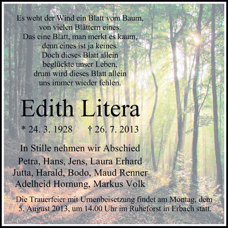 Hier finden Sie alle Traueranzeigen aus der Zeitung, die bisher für Edith Litera erschienen sind. Weitere Traueranzeigen, die in der Zeitung erscheinen, werden hier ebenfalls aufgelistet