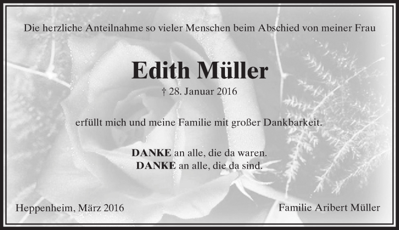 Hier finden Sie alle Traueranzeigen aus der Zeitung, die bisher für Edith Müller erschienen sind. Weitere Traueranzeigen, die in der Zeitung erscheinen, werden hier ebenfalls aufgelistet