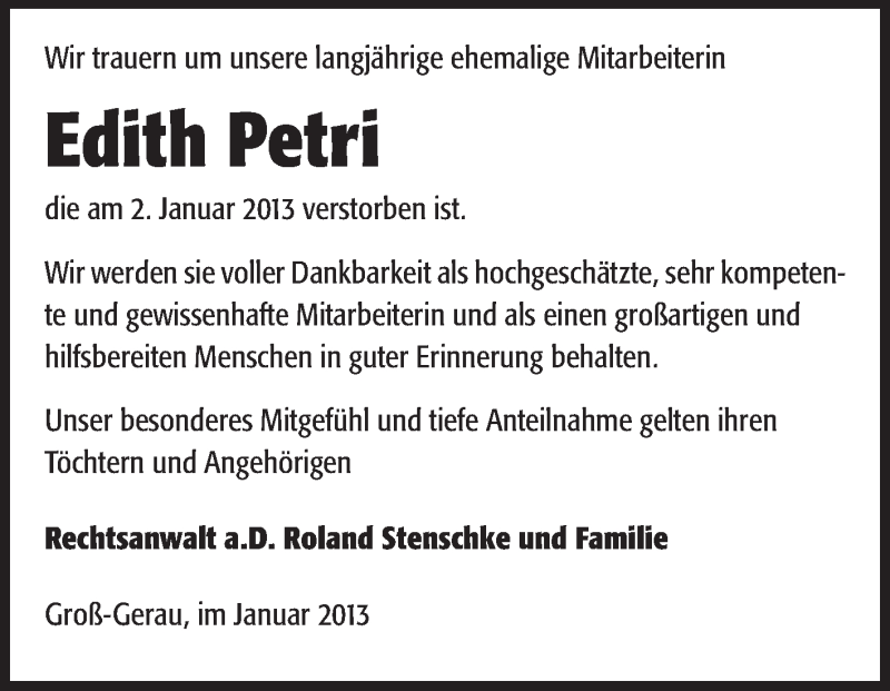 Hier finden Sie alle Traueranzeigen aus der Zeitung, die bisher für Edith Petri erschienen sind. Weitere Traueranzeigen, die in der Zeitung erscheinen, werden hier ebenfalls aufgelistet