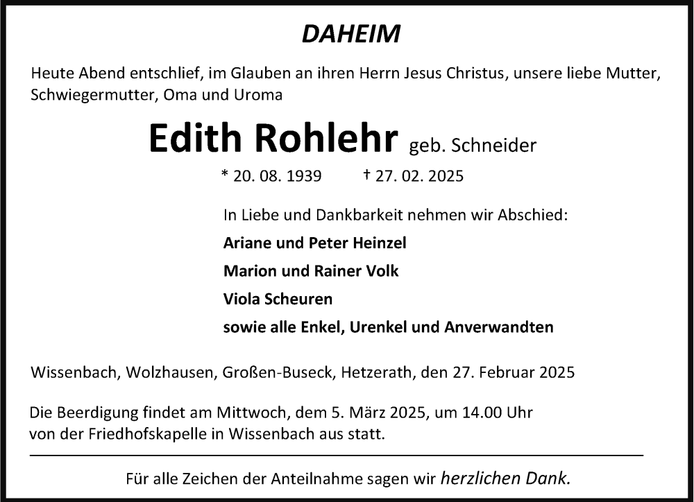 Hier finden Sie alle Traueranzeigen aus der Zeitung, die bisher für Edith Rohlehr erschienen sind. Weitere Traueranzeigen, die in der Zeitung erscheinen, werden hier ebenfalls aufgelistet
