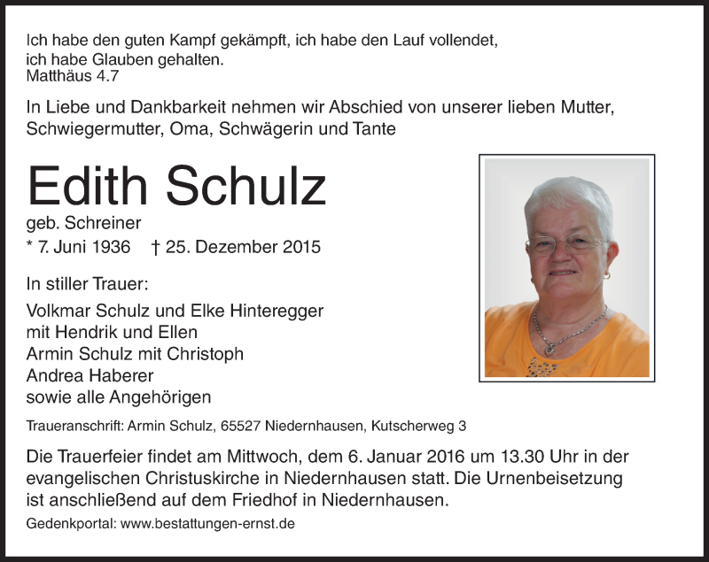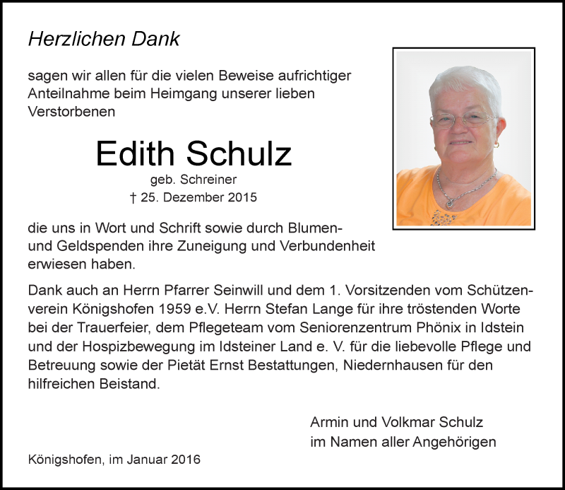 Hier finden Sie alle Traueranzeigen aus der Zeitung, die bisher für Edith Schulz erschienen sind. Weitere Traueranzeigen, die in der Zeitung erscheinen, werden hier ebenfalls aufgelistet