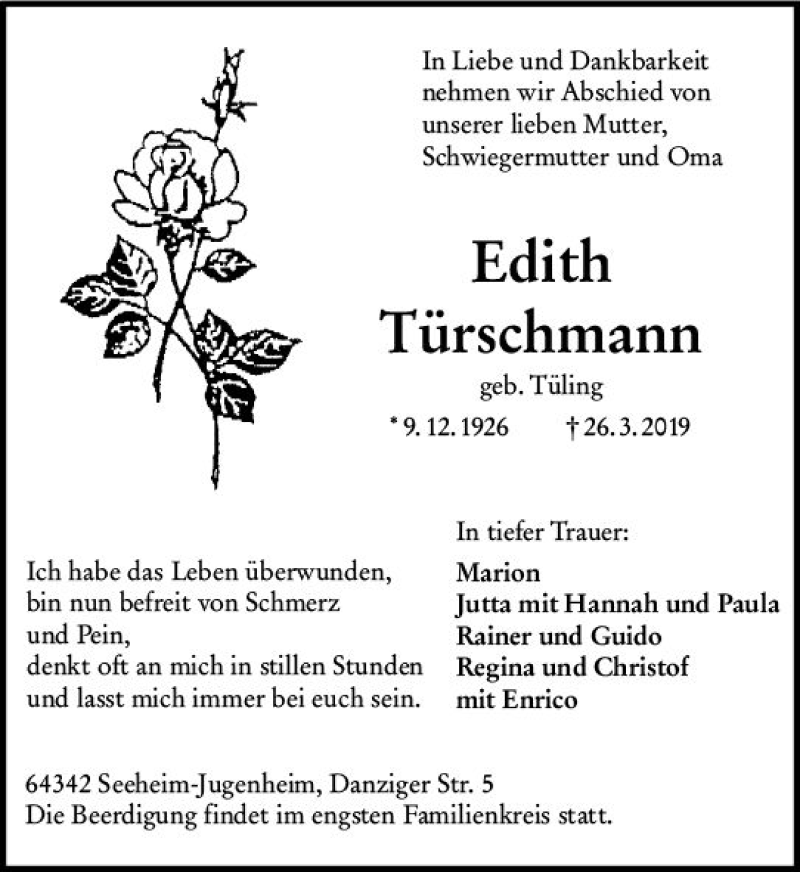 Hier finden Sie alle Traueranzeigen aus der Zeitung, die bisher für Edith Türschmann erschienen sind. Weitere Traueranzeigen, die in der Zeitung erscheinen, werden hier ebenfalls aufgelistet