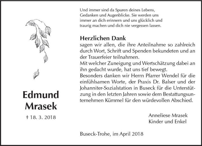 Hier finden Sie alle Traueranzeigen aus der Zeitung, die bisher für Edmund Mrasek erschienen sind. Weitere Traueranzeigen, die in der Zeitung erscheinen, werden hier ebenfalls aufgelistet