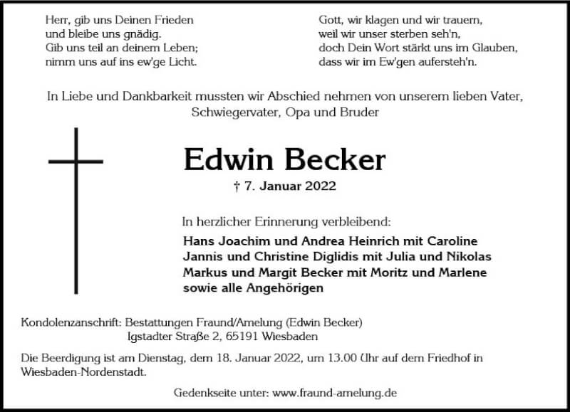 Hier finden Sie alle Traueranzeigen aus der Zeitung, die bisher für Edwin Becker erschienen sind. Weitere Traueranzeigen, die in der Zeitung erscheinen, werden hier ebenfalls aufgelistet