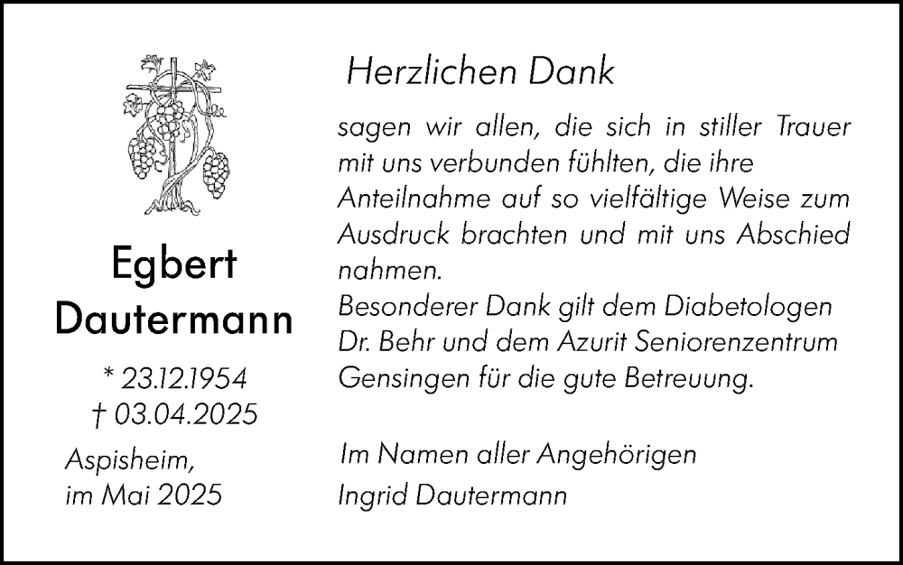 Hier finden Sie alle Traueranzeigen aus der Zeitung, die bisher für Egbert Dautermann erschienen sind. Weitere Traueranzeigen, die in der Zeitung erscheinen, werden hier ebenfalls aufgelistet