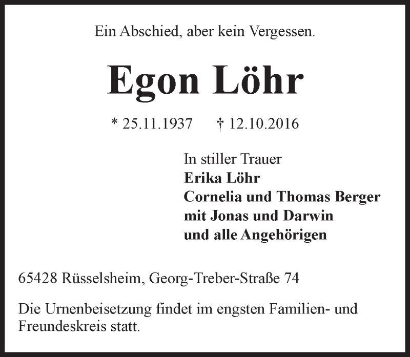 Hier finden Sie alle Traueranzeigen aus der Zeitung, die bisher für Egon Löhr erschienen sind. Weitere Traueranzeigen, die in der Zeitung erscheinen, werden hier ebenfalls aufgelistet