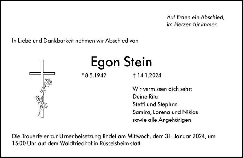Hier finden Sie alle Traueranzeigen aus der Zeitung, die bisher für Egon Stein erschienen sind. Weitere Traueranzeigen, die in der Zeitung erscheinen, werden hier ebenfalls aufgelistet