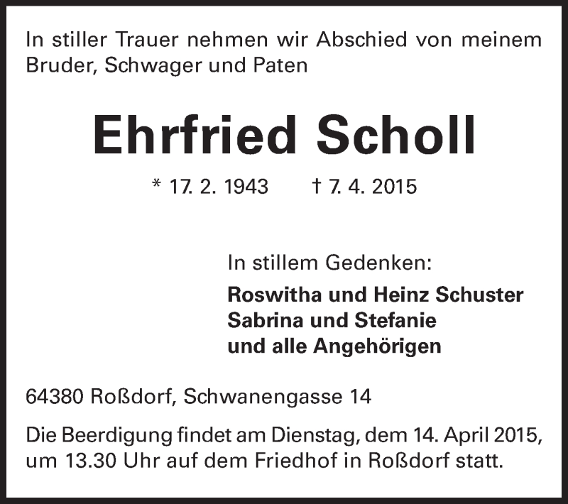 Hier finden Sie alle Traueranzeigen aus der Zeitung, die bisher für Ehrfried Scholl erschienen sind. Weitere Traueranzeigen, die in der Zeitung erscheinen, werden hier ebenfalls aufgelistet