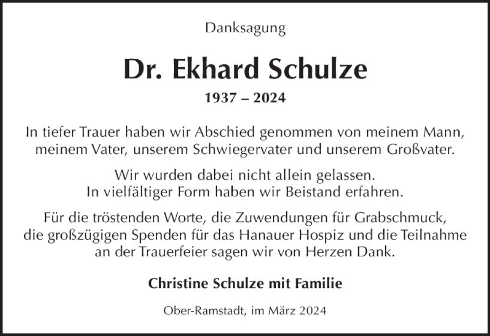 Hier finden Sie alle Traueranzeigen aus der Zeitung, die bisher für Ekhard Schulze erschienen sind. Weitere Traueranzeigen, die in der Zeitung erscheinen, werden hier ebenfalls aufgelistet
