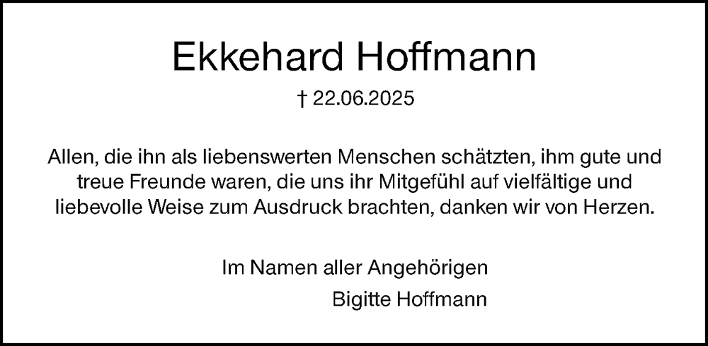 Hier finden Sie alle Traueranzeigen aus der Zeitung, die bisher für Ekkehard Hoffmann erschienen sind. Weitere Traueranzeigen, die in der Zeitung erscheinen, werden hier ebenfalls aufgelistet