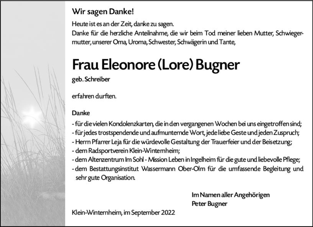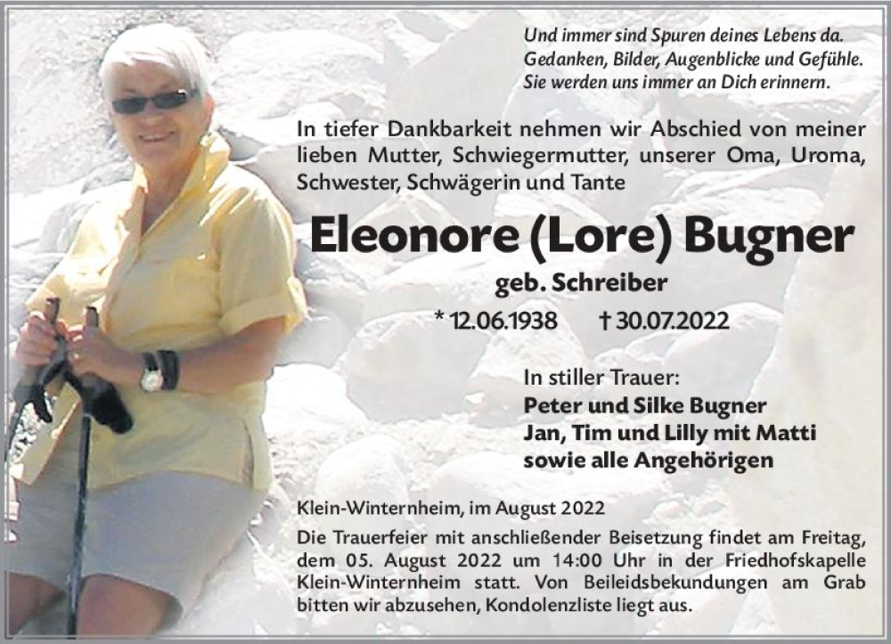 Hier finden Sie alle Traueranzeigen aus der Zeitung, die bisher für Eleonore Bugner erschienen sind. Weitere Traueranzeigen, die in der Zeitung erscheinen, werden hier ebenfalls aufgelistet