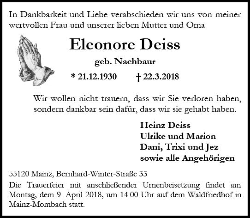 Hier finden Sie alle Traueranzeigen aus der Zeitung, die bisher für Eleonore Deiss erschienen sind. Weitere Traueranzeigen, die in der Zeitung erscheinen, werden hier ebenfalls aufgelistet