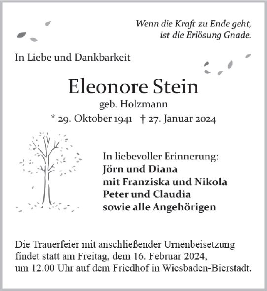 Hier finden Sie alle Traueranzeigen aus der Zeitung, die bisher für Eleonore Stein erschienen sind. Weitere Traueranzeigen, die in der Zeitung erscheinen, werden hier ebenfalls aufgelistet