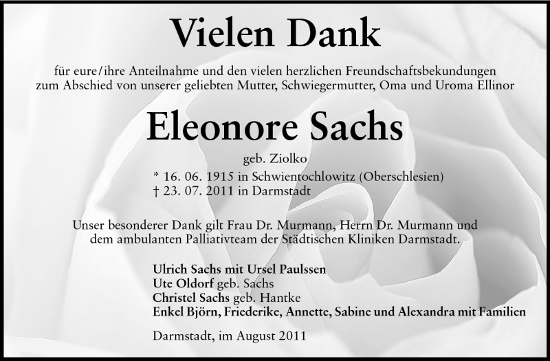 Hier finden Sie alle Traueranzeigen aus der Zeitung, die bisher für Eleonore Maria Sachs erschienen sind. Weitere Traueranzeigen, die in der Zeitung erscheinen, werden hier ebenfalls aufgelistet