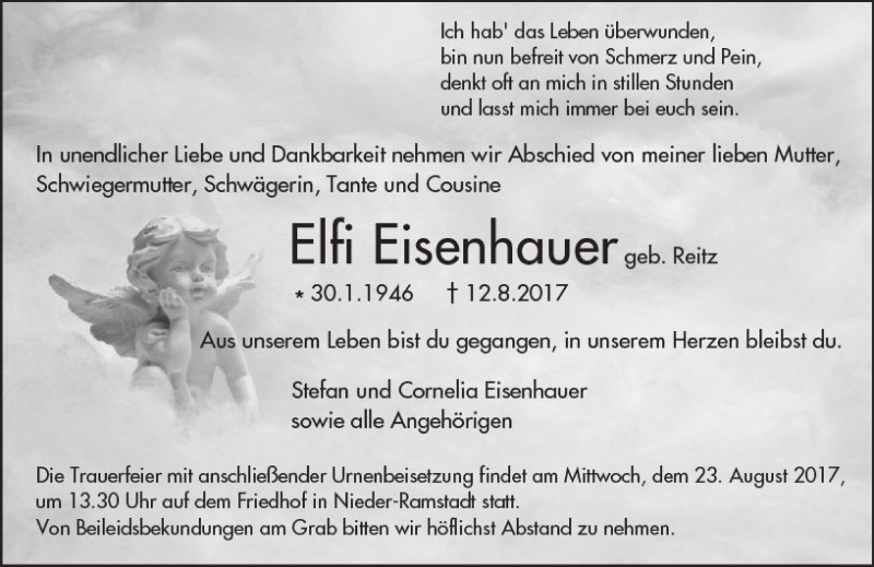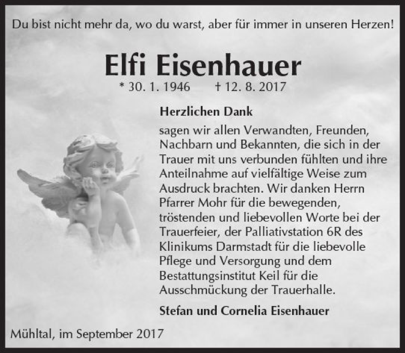Hier finden Sie alle Traueranzeigen aus der Zeitung, die bisher für Elfi Eisenhauer erschienen sind. Weitere Traueranzeigen, die in der Zeitung erscheinen, werden hier ebenfalls aufgelistet