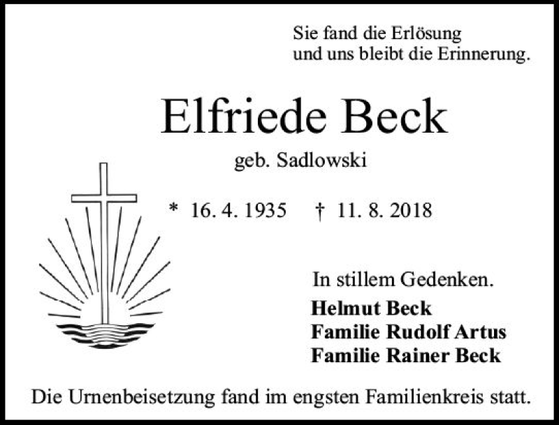 Hier finden Sie alle Traueranzeigen aus der Zeitung, die bisher für Elfriede Beck erschienen sind. Weitere Traueranzeigen, die in der Zeitung erscheinen, werden hier ebenfalls aufgelistet