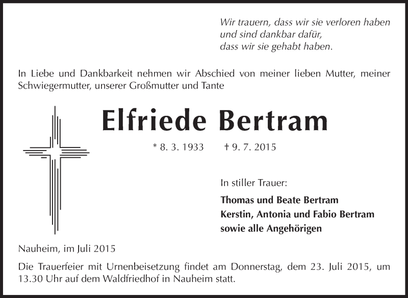 Hier finden Sie alle Traueranzeigen aus der Zeitung, die bisher für Elfriede Bertram erschienen sind. Weitere Traueranzeigen, die in der Zeitung erscheinen, werden hier ebenfalls aufgelistet