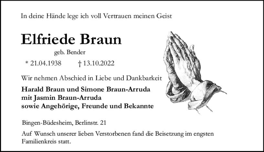 Hier finden Sie alle Traueranzeigen aus der Zeitung, die bisher für Elfriede Braun erschienen sind. Weitere Traueranzeigen, die in der Zeitung erscheinen, werden hier ebenfalls aufgelistet