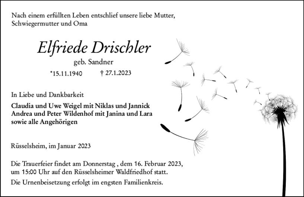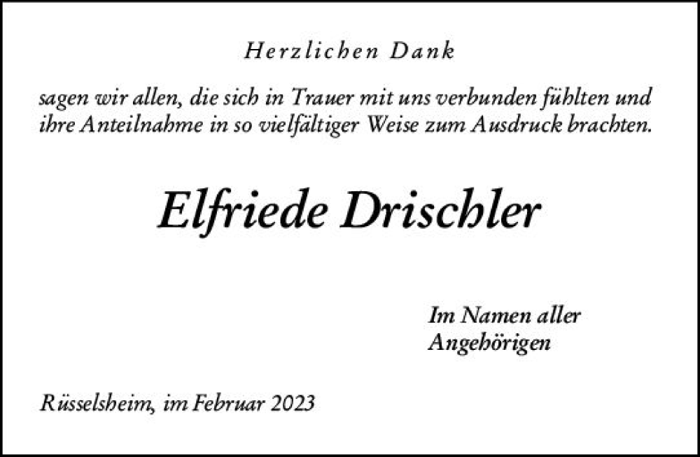 Hier finden Sie alle Traueranzeigen aus der Zeitung, die bisher für Elfriede Drischler erschienen sind. Weitere Traueranzeigen, die in der Zeitung erscheinen, werden hier ebenfalls aufgelistet