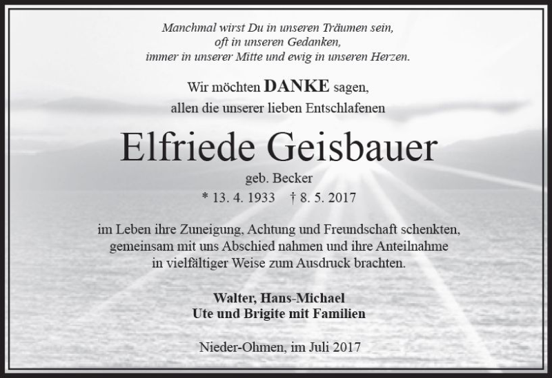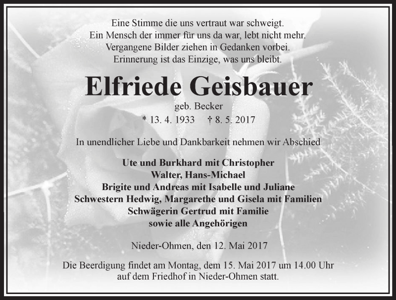 Hier finden Sie alle Traueranzeigen aus der Zeitung, die bisher für Elfriede Geisbauer erschienen sind. Weitere Traueranzeigen, die in der Zeitung erscheinen, werden hier ebenfalls aufgelistet