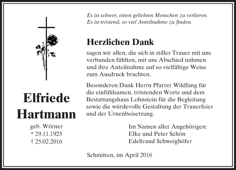 Hier finden Sie alle Traueranzeigen aus der Zeitung, die bisher für Elfriede Hartmann erschienen sind. Weitere Traueranzeigen, die in der Zeitung erscheinen, werden hier ebenfalls aufgelistet