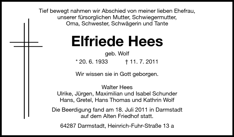 Hier finden Sie alle Traueranzeigen aus der Zeitung, die bisher für Elfriede Hees erschienen sind. Weitere Traueranzeigen, die in der Zeitung erscheinen, werden hier ebenfalls aufgelistet