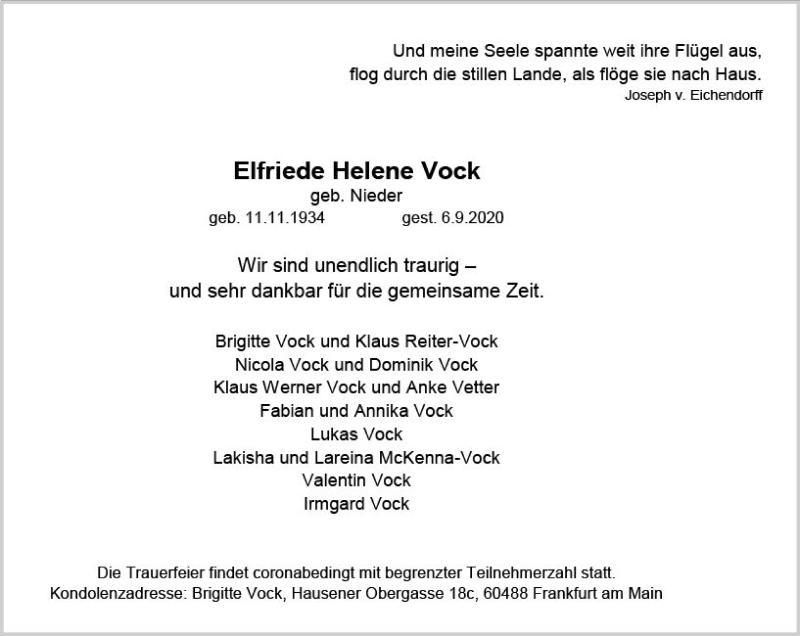 Hier finden Sie alle Traueranzeigen aus der Zeitung, die bisher für Elfriede Helene Vock erschienen sind. Weitere Traueranzeigen, die in der Zeitung erscheinen, werden hier ebenfalls aufgelistet