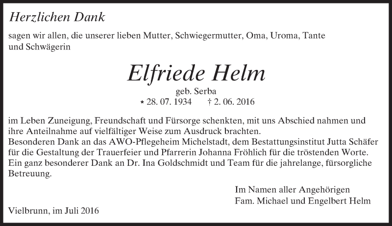 Hier finden Sie alle Traueranzeigen aus der Zeitung, die bisher für Elfriede Helm erschienen sind. Weitere Traueranzeigen, die in der Zeitung erscheinen, werden hier ebenfalls aufgelistet