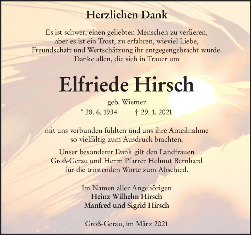 Hier finden Sie alle Traueranzeigen aus der Zeitung, die bisher für Elfriede Hirsch erschienen sind. Weitere Traueranzeigen, die in der Zeitung erscheinen, werden hier ebenfalls aufgelistet
