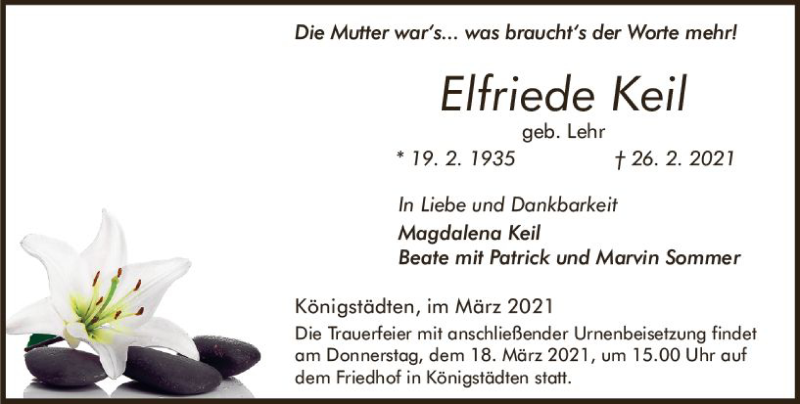 Hier finden Sie alle Traueranzeigen aus der Zeitung, die bisher für Elfriede Keil erschienen sind. Weitere Traueranzeigen, die in der Zeitung erscheinen, werden hier ebenfalls aufgelistet