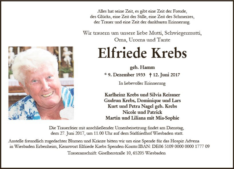 Hier finden Sie alle Traueranzeigen aus der Zeitung, die bisher für Elfriede Krebs erschienen sind. Weitere Traueranzeigen, die in der Zeitung erscheinen, werden hier ebenfalls aufgelistet