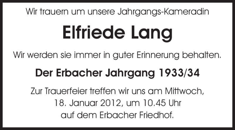 Hier finden Sie alle Traueranzeigen aus der Zeitung, die bisher für Elfriede Lang erschienen sind. Weitere Traueranzeigen, die in der Zeitung erscheinen, werden hier ebenfalls aufgelistet