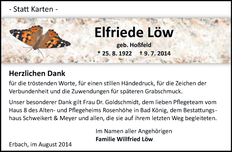 Hier finden Sie alle Traueranzeigen aus der Zeitung, die bisher für Elfriede Löw erschienen sind. Weitere Traueranzeigen, die in der Zeitung erscheinen, werden hier ebenfalls aufgelistet