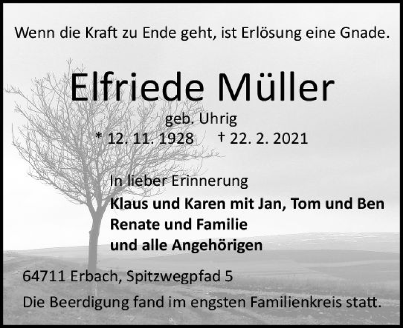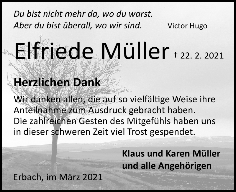 Hier finden Sie alle Traueranzeigen aus der Zeitung, die bisher für Elfriede Müller erschienen sind. Weitere Traueranzeigen, die in der Zeitung erscheinen, werden hier ebenfalls aufgelistet
