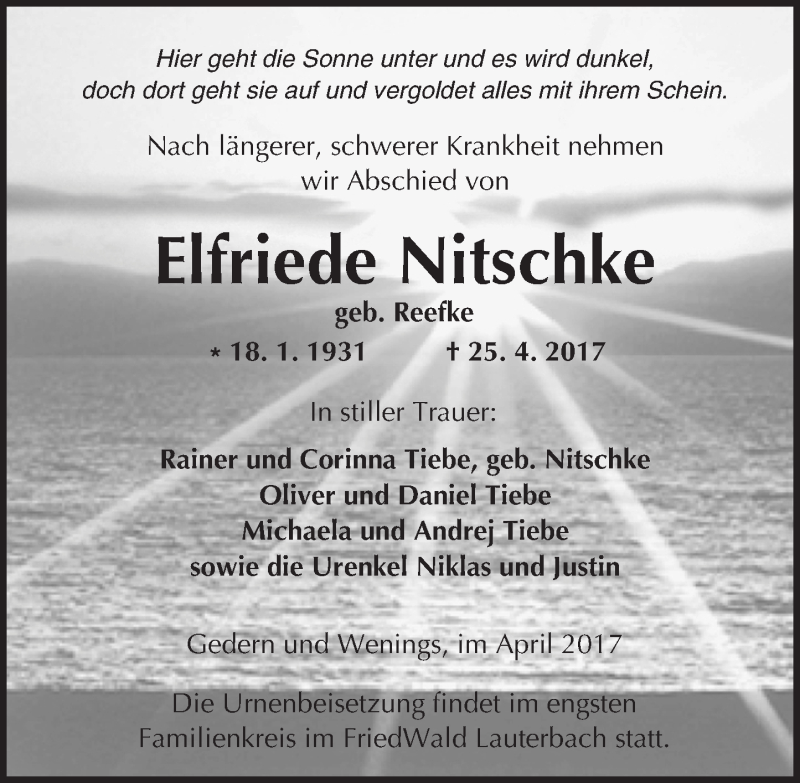 Hier finden Sie alle Traueranzeigen aus der Zeitung, die bisher für Elfriede Nitschke erschienen sind. Weitere Traueranzeigen, die in der Zeitung erscheinen, werden hier ebenfalls aufgelistet
