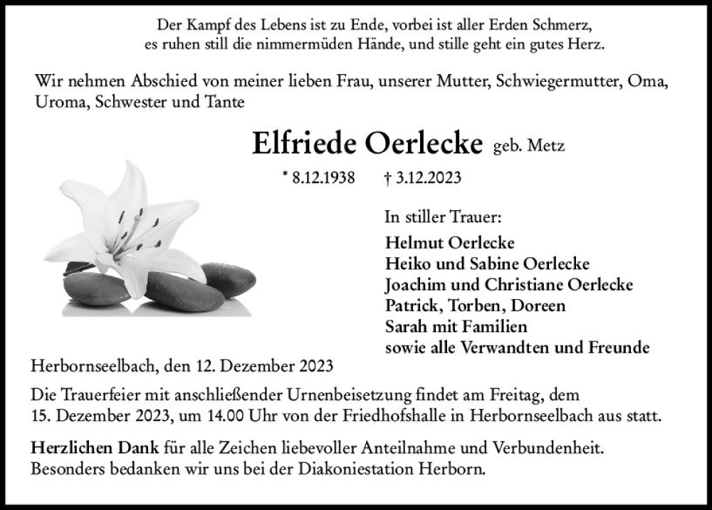 Hier finden Sie alle Traueranzeigen aus der Zeitung, die bisher für Elfriede Oerlecke erschienen sind. Weitere Traueranzeigen, die in der Zeitung erscheinen, werden hier ebenfalls aufgelistet