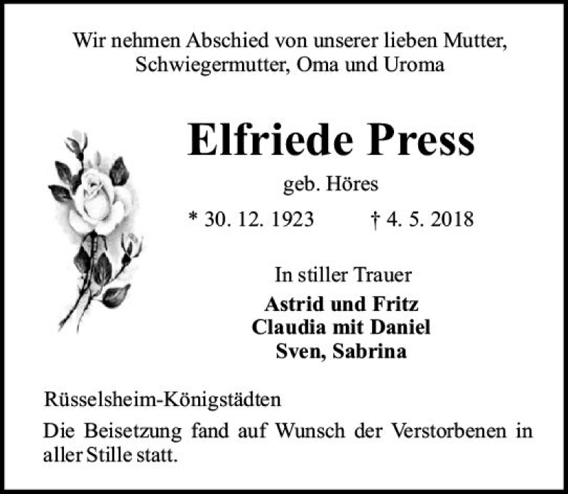 Hier finden Sie alle Traueranzeigen aus der Zeitung, die bisher für Elfriede Press erschienen sind. Weitere Traueranzeigen, die in der Zeitung erscheinen, werden hier ebenfalls aufgelistet
