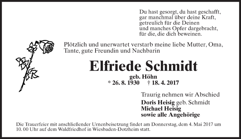 Hier finden Sie alle Traueranzeigen aus der Zeitung, die bisher für Elfriede Schmidt erschienen sind. Weitere Traueranzeigen, die in der Zeitung erscheinen, werden hier ebenfalls aufgelistet