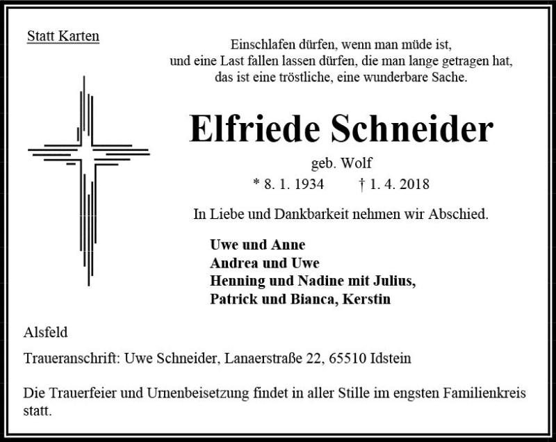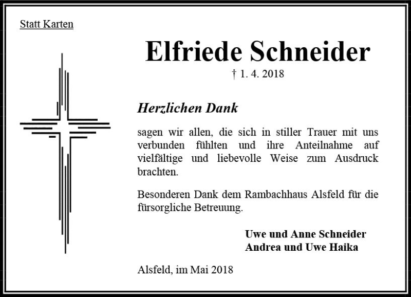 Hier finden Sie alle Traueranzeigen aus der Zeitung, die bisher für Elfriede Schneider erschienen sind. Weitere Traueranzeigen, die in der Zeitung erscheinen, werden hier ebenfalls aufgelistet