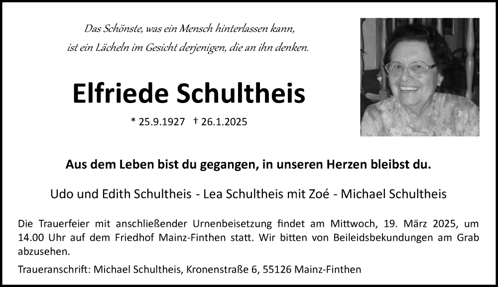 Hier finden Sie alle Traueranzeigen aus der Zeitung, die bisher für Elfriede Schultheis erschienen sind. Weitere Traueranzeigen, die in der Zeitung erscheinen, werden hier ebenfalls aufgelistet