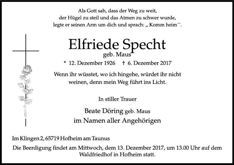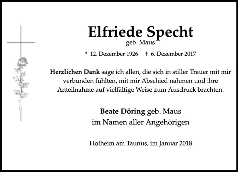 Hier finden Sie alle Traueranzeigen aus der Zeitung, die bisher für Elfriede Specht erschienen sind. Weitere Traueranzeigen, die in der Zeitung erscheinen, werden hier ebenfalls aufgelistet