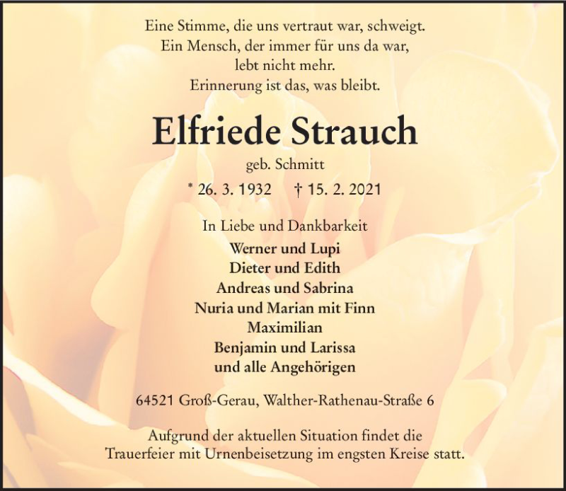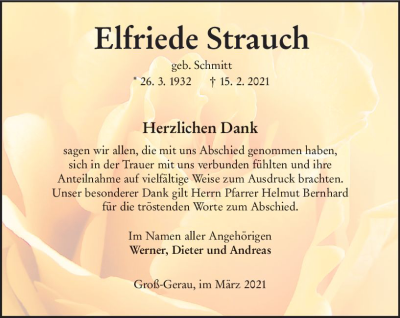Hier finden Sie alle Traueranzeigen aus der Zeitung, die bisher für Elfriede Strauch erschienen sind. Weitere Traueranzeigen, die in der Zeitung erscheinen, werden hier ebenfalls aufgelistet