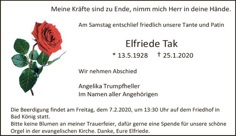 Hier finden Sie alle Traueranzeigen aus der Zeitung, die bisher für Elfriede Tak erschienen sind. Weitere Traueranzeigen, die in der Zeitung erscheinen, werden hier ebenfalls aufgelistet