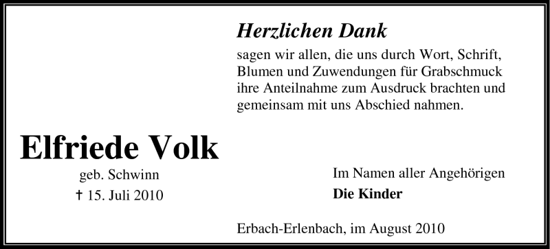 Hier finden Sie alle Traueranzeigen aus der Zeitung, die bisher für Elfriede Volk erschienen sind. Weitere Traueranzeigen, die in der Zeitung erscheinen, werden hier ebenfalls aufgelistet