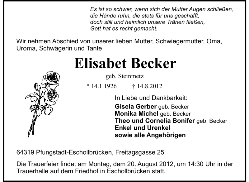 Hier finden Sie alle Traueranzeigen aus der Zeitung, die bisher für Elisabet Becker erschienen sind. Weitere Traueranzeigen, die in der Zeitung erscheinen, werden hier ebenfalls aufgelistet