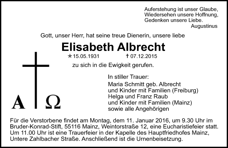 Hier finden Sie alle Traueranzeigen aus der Zeitung, die bisher für Elisabeth Albrecht erschienen sind. Weitere Traueranzeigen, die in der Zeitung erscheinen, werden hier ebenfalls aufgelistet