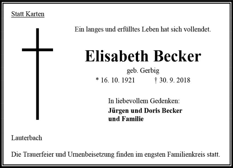 Hier finden Sie alle Traueranzeigen aus der Zeitung, die bisher für Elisabeth Becker erschienen sind. Weitere Traueranzeigen, die in der Zeitung erscheinen, werden hier ebenfalls aufgelistet