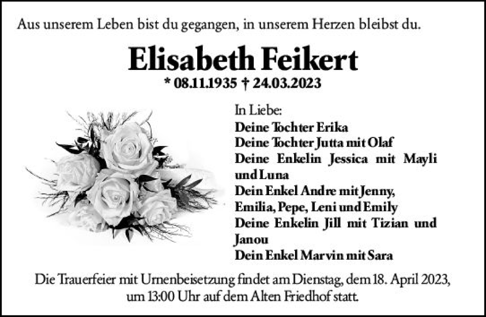 Hier finden Sie alle Traueranzeigen aus der Zeitung, die bisher für Elisabeth Feikert erschienen sind. Weitere Traueranzeigen, die in der Zeitung erscheinen, werden hier ebenfalls aufgelistet